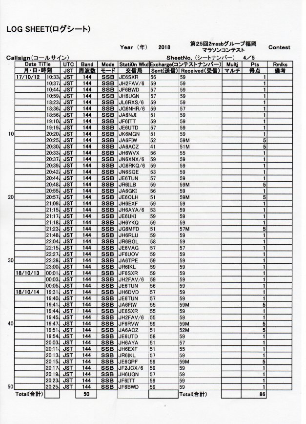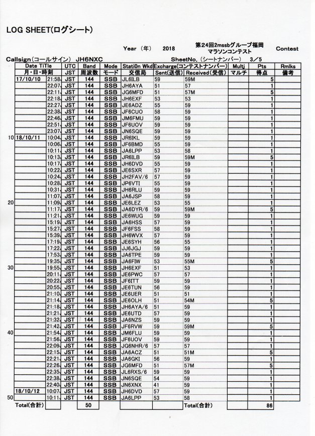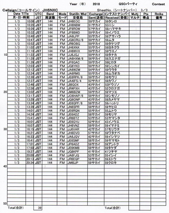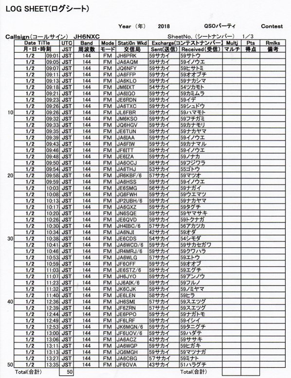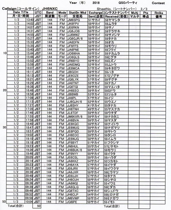 ○2018 NEW YEAR PARTY 144Mhz FM 交信ログシート