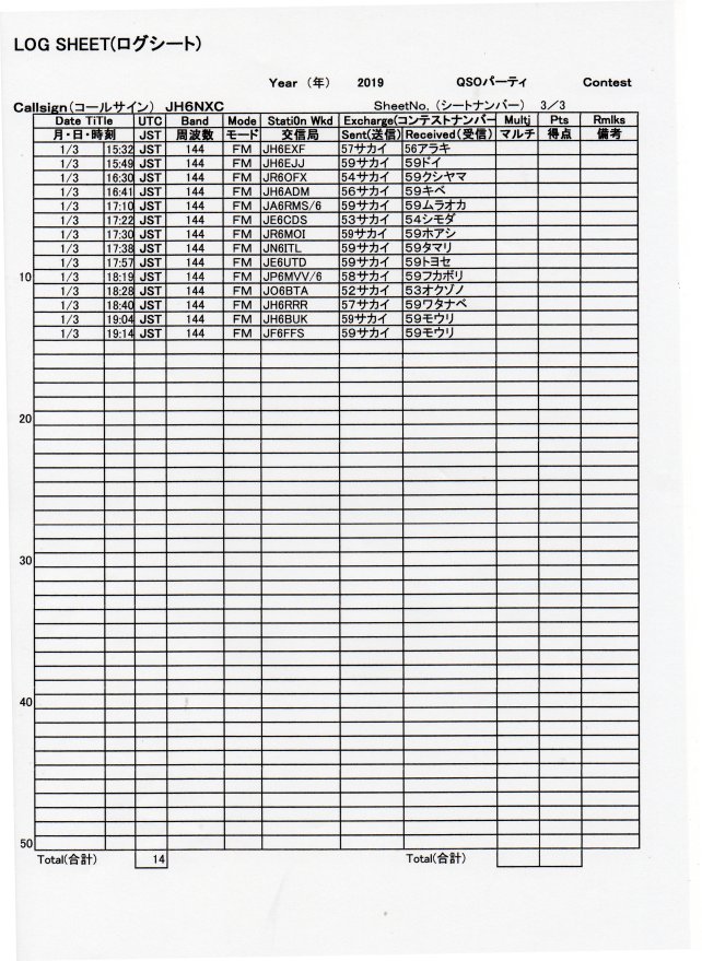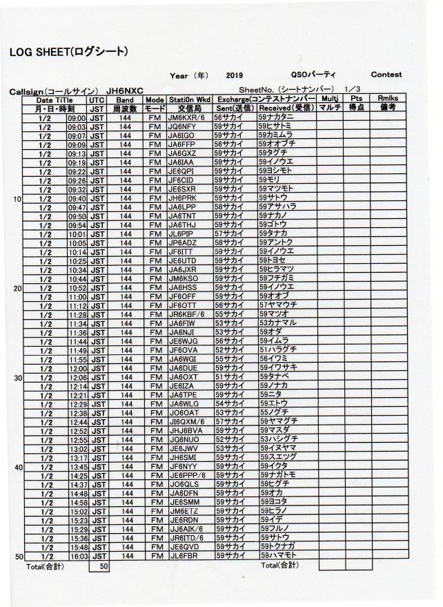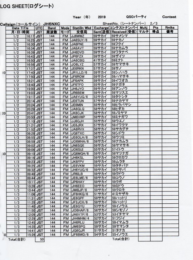 ○2019 NEW YEAR PARTY 144Mhz FM 交信ログシート