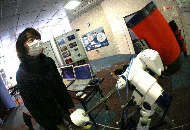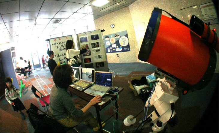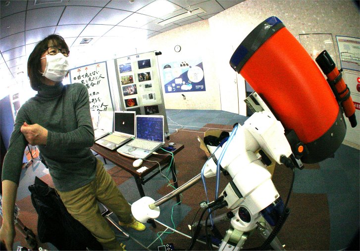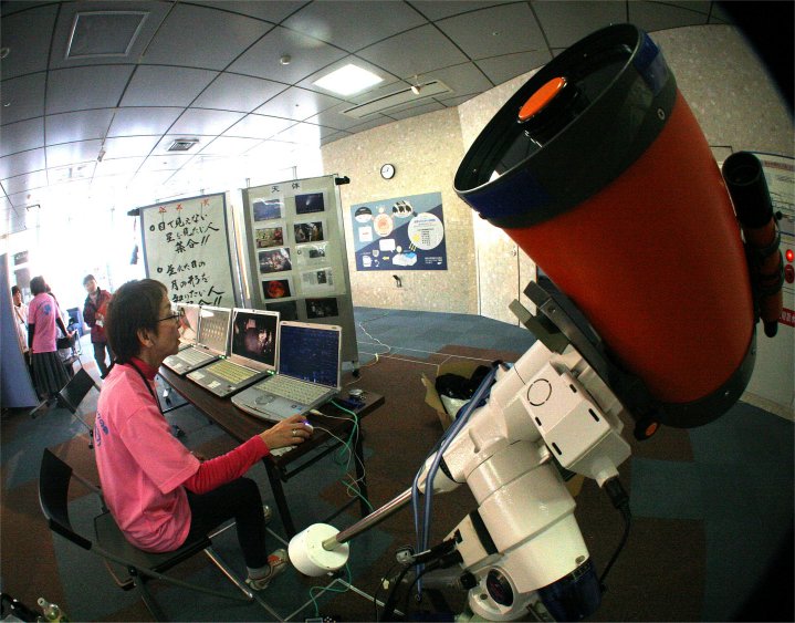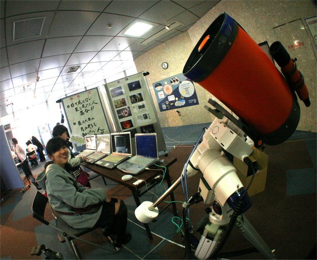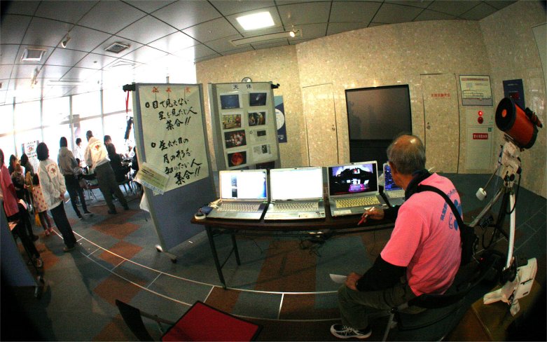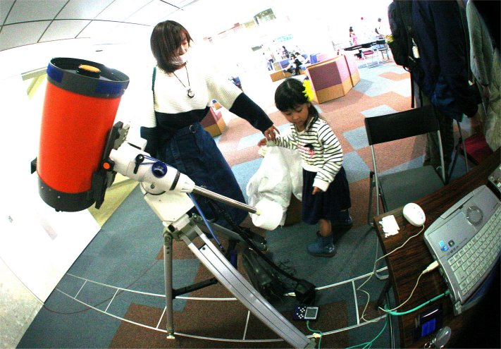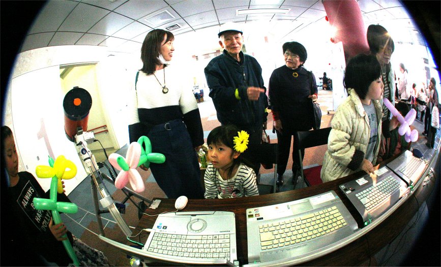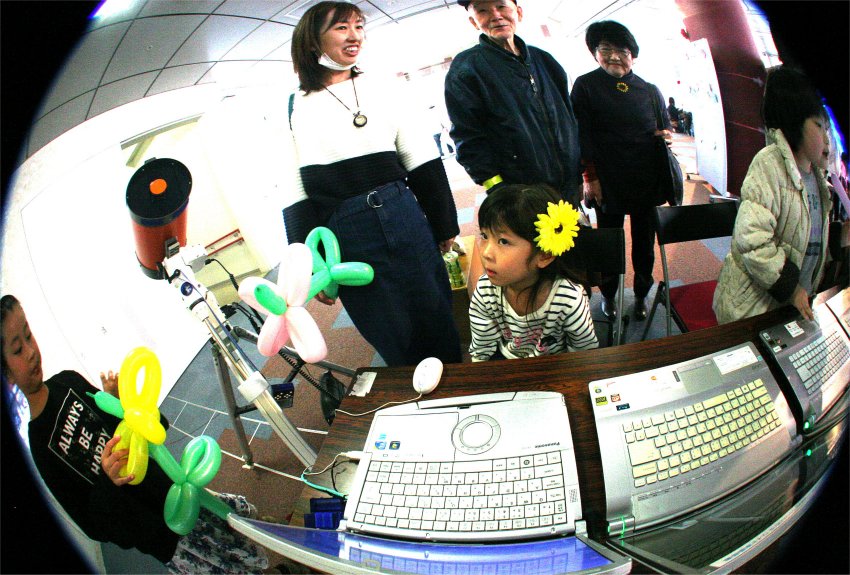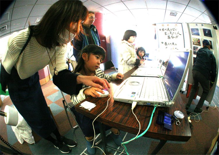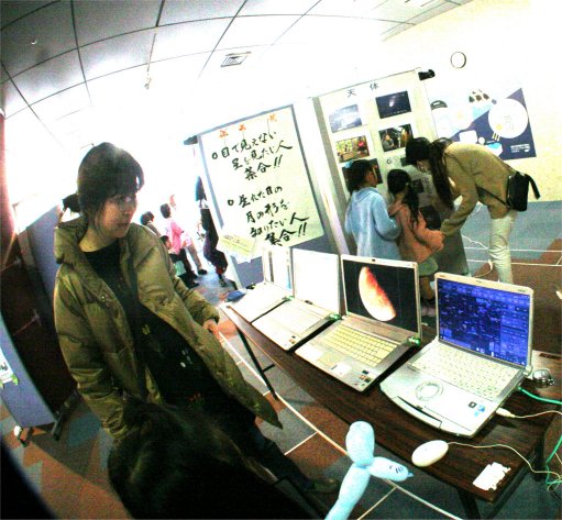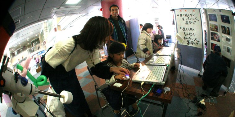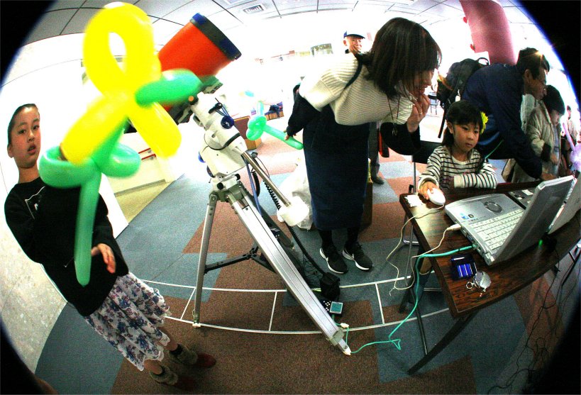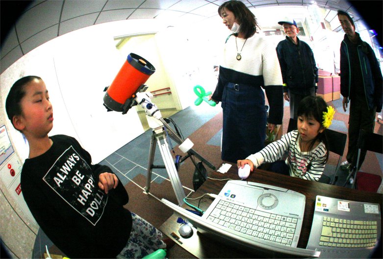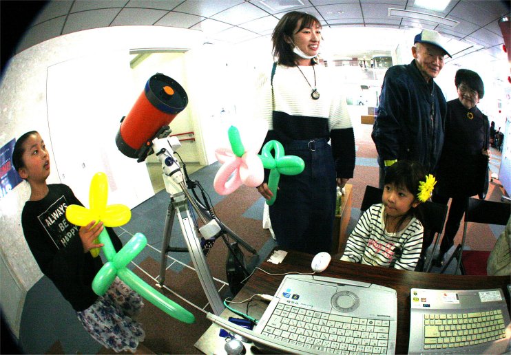 示や天体望遠鏡をパソコンで制御する体験コーナーを設け、その時のスナップ写真を掲載したものです。