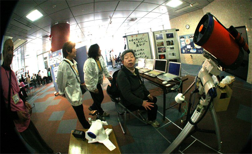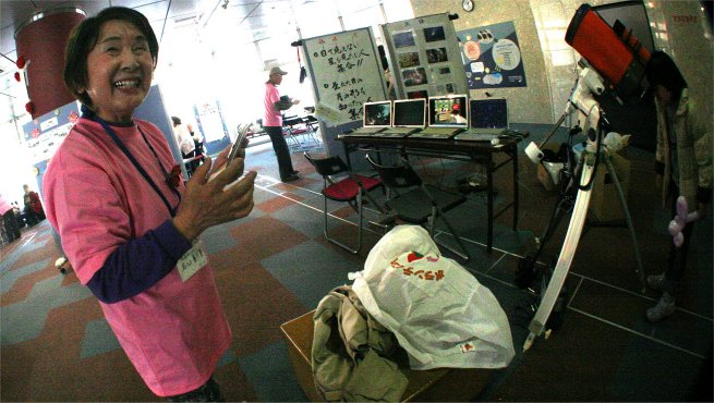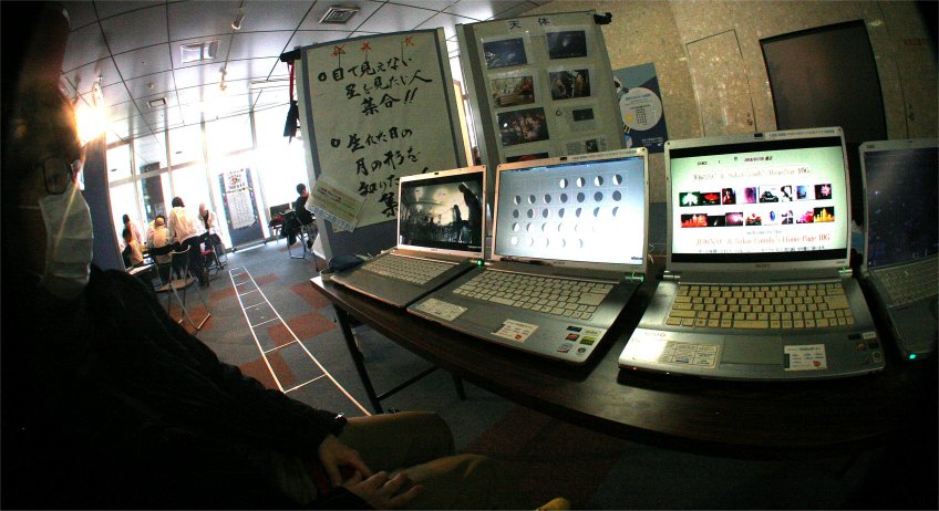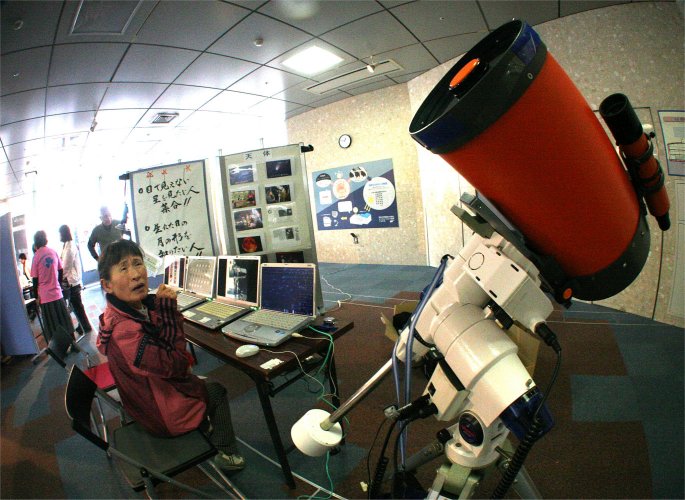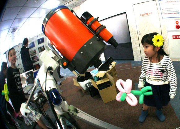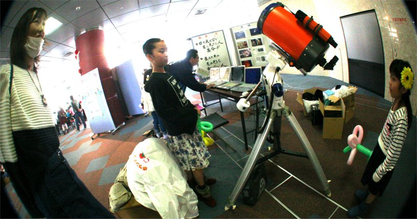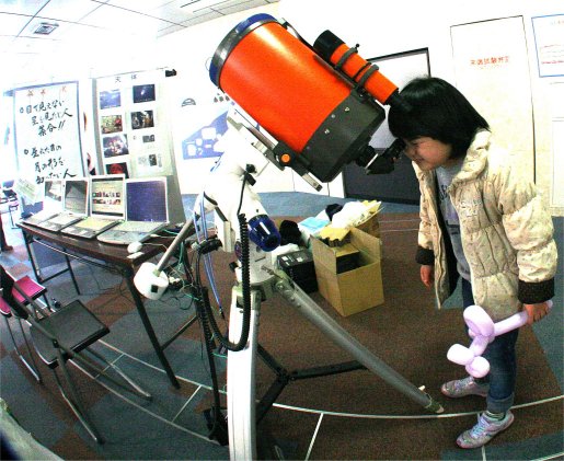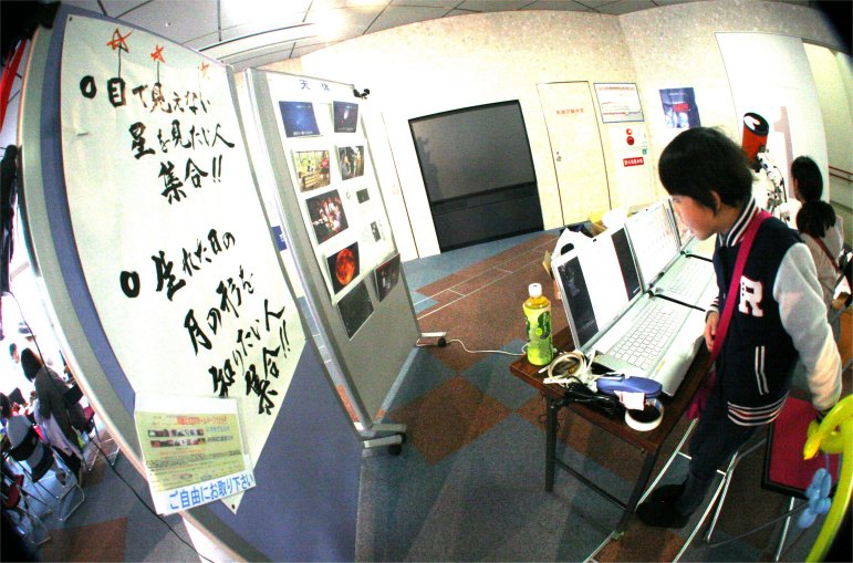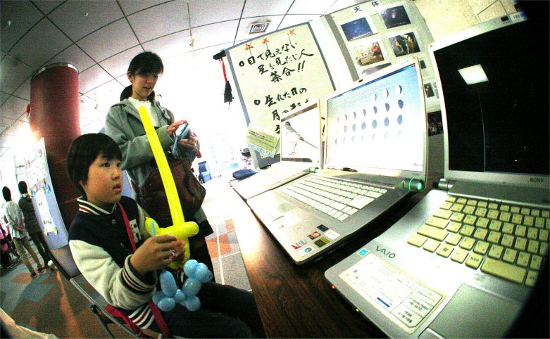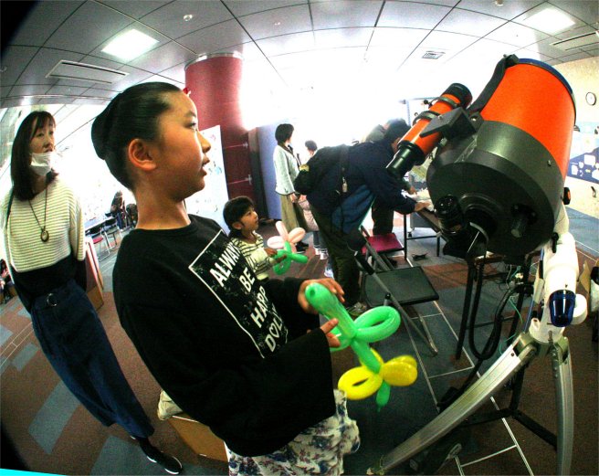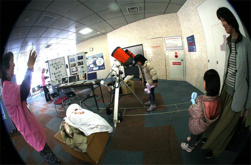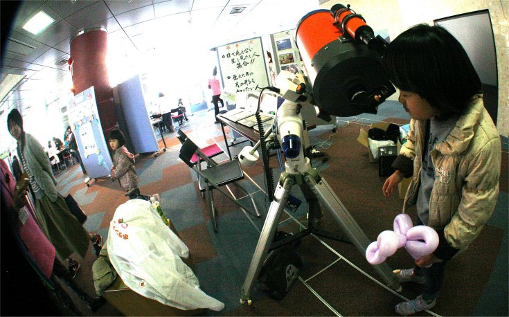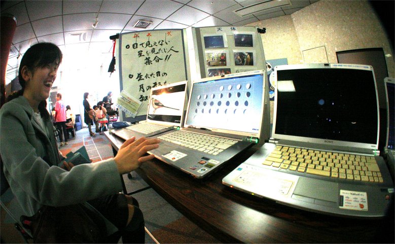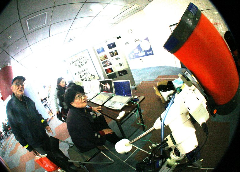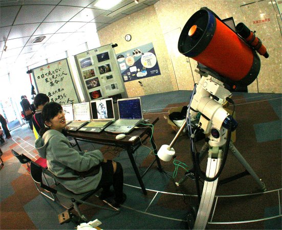示や天体望遠鏡をパソコンで制御する体験コーナーを設け、その時のスナップ写真を掲載したものです。