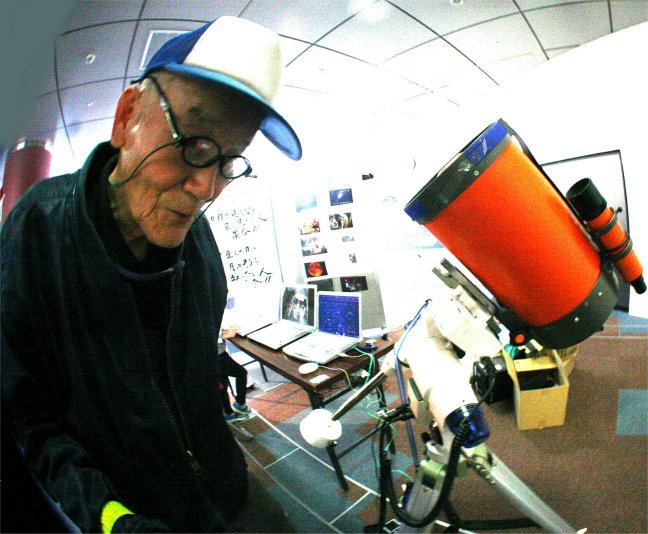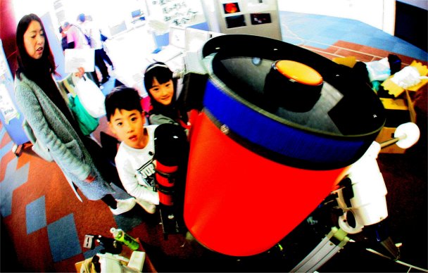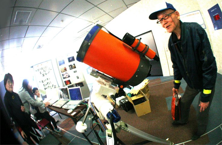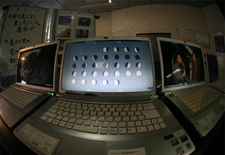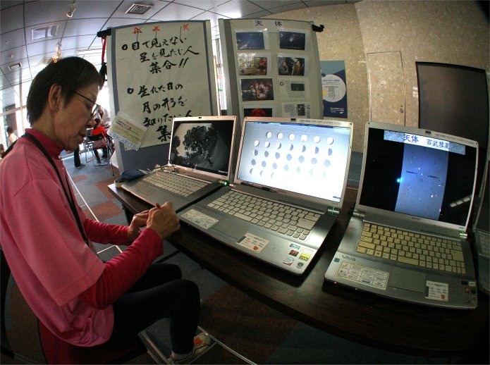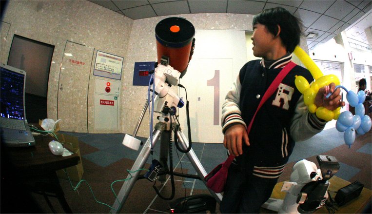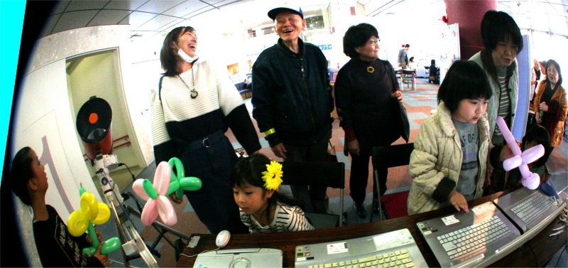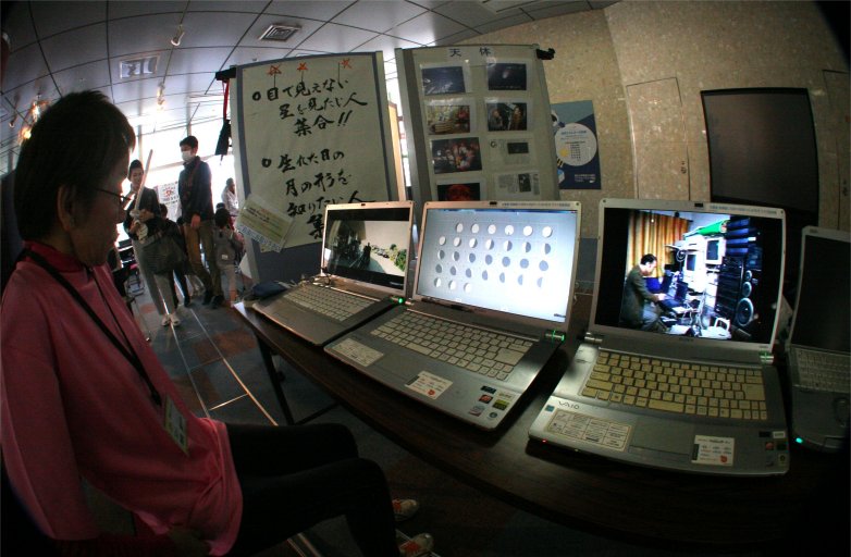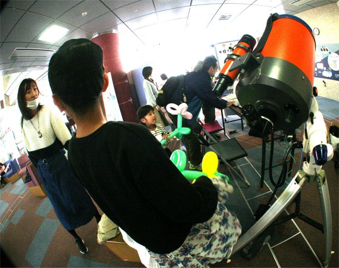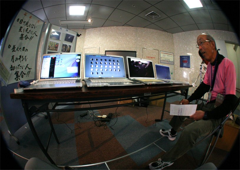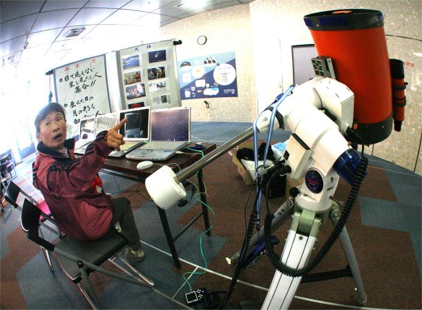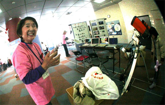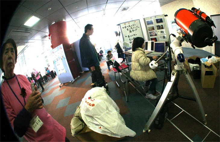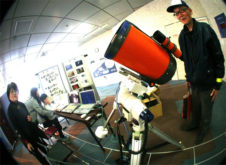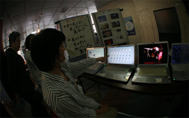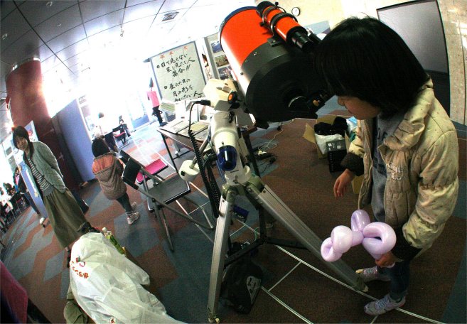 示や天体望遠鏡をパソコンで制御する体験コーナーを設け、その時のスナップ写真を掲載したものです。
