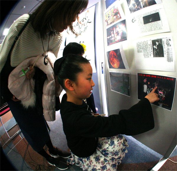 に出演した写真や近所の子供さんや保護者を招いて自宅の広場実施している観月・観望・星空研究会の写真のパネル展
