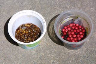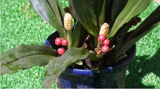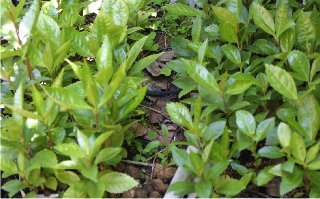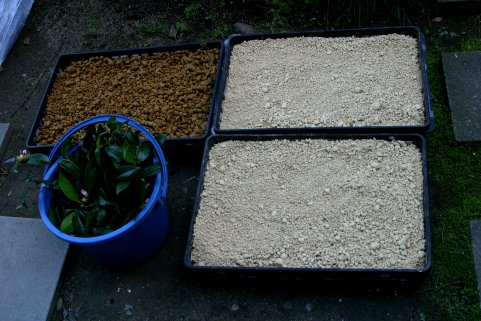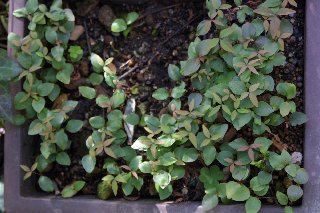 実生育苗中の千両(春取り蒔き1年目、2年目)、万両