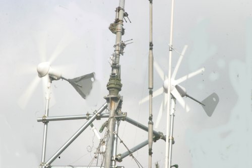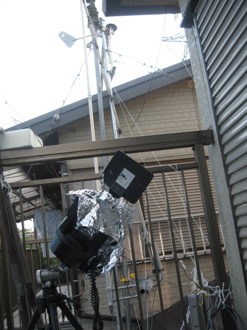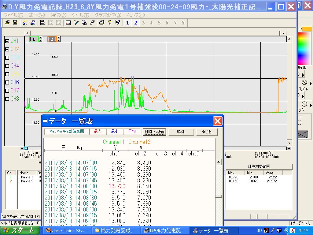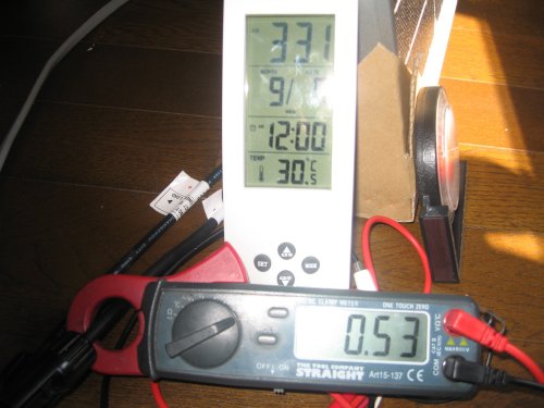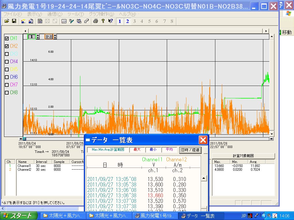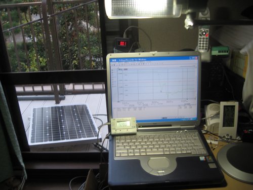 ほぼ並行して太陽光発電も実施。朝から夕方までの太陽光の高度を測定すると共に入射角と発電量の相関関係も記録。最大の効率を得るために天体観測用の赤道儀も活用し太陽の動きを追跡しながら発電量を記録確認。 最後には風力発電装置と太陽光発電のハイブリッド発電を行い2チャンネルデーターロガを使用して同時測定をおこなった。 その結果は以外な結果となった。