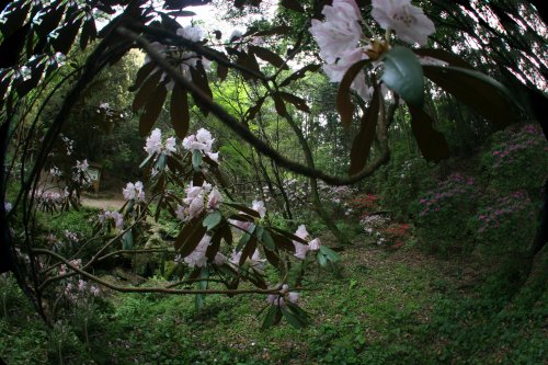 満開をやや過ぎた天拝山登山道入り口のシャクナゲ谷