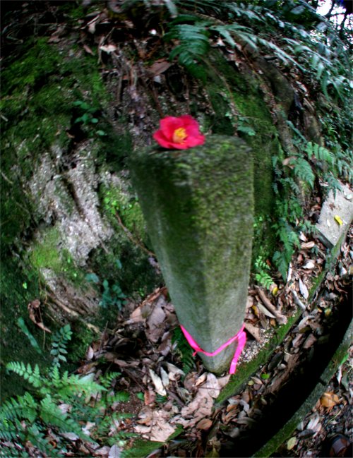 天拝山登山道入り口付近で見た杭の上の一輪の椿