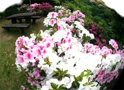天拝山登山道入り口付近の転配公園の満開のツツジ