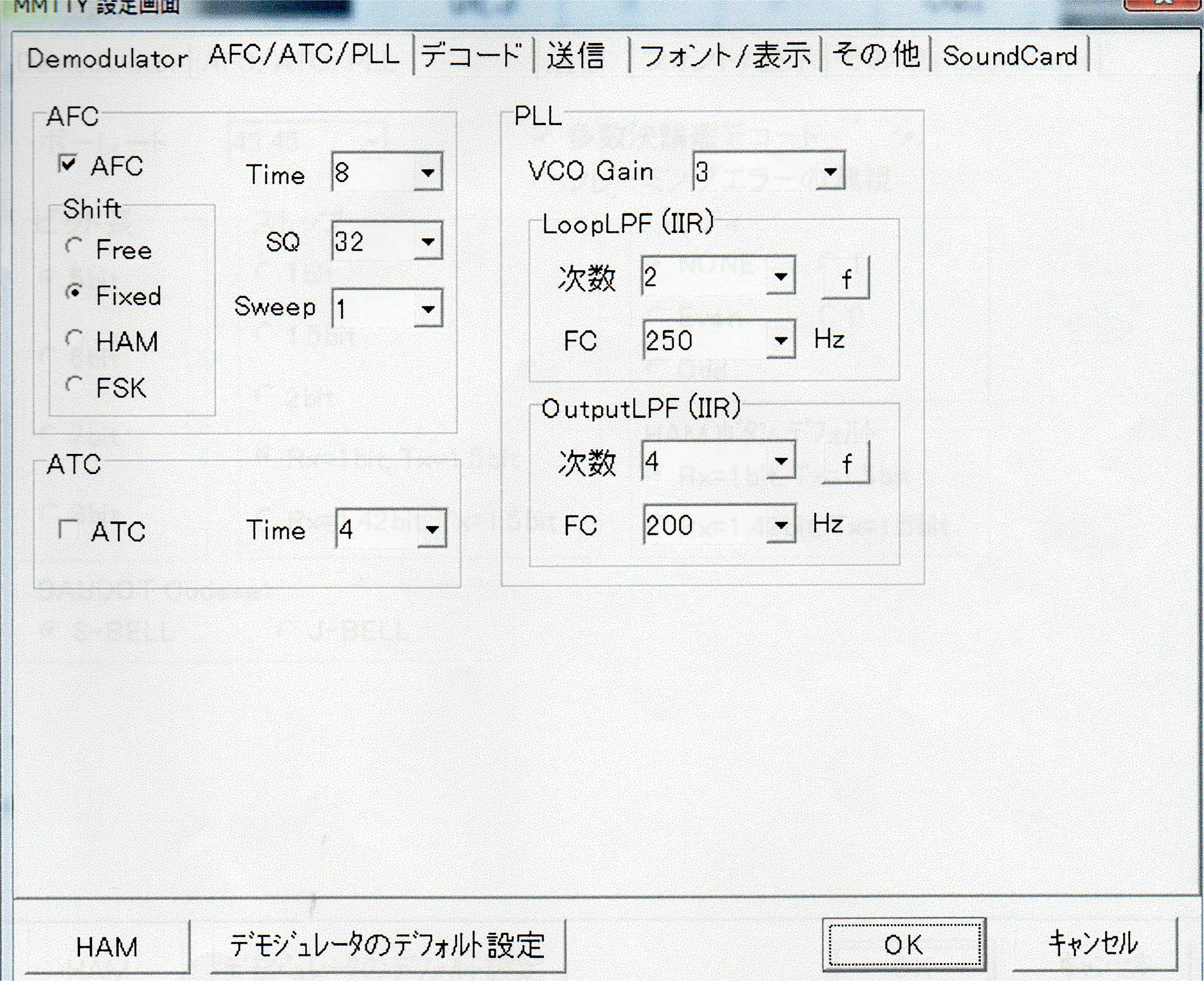 TS2000 > VAIO MMTTY AFC/ATC/PLL 設定画面
